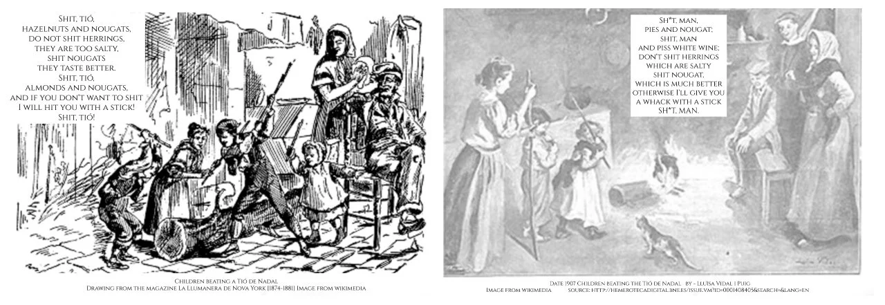 A traditional seasonal song is sung to the Tió de Nadal to encourage ‘him’ to defecate. Here are a couple of examples: